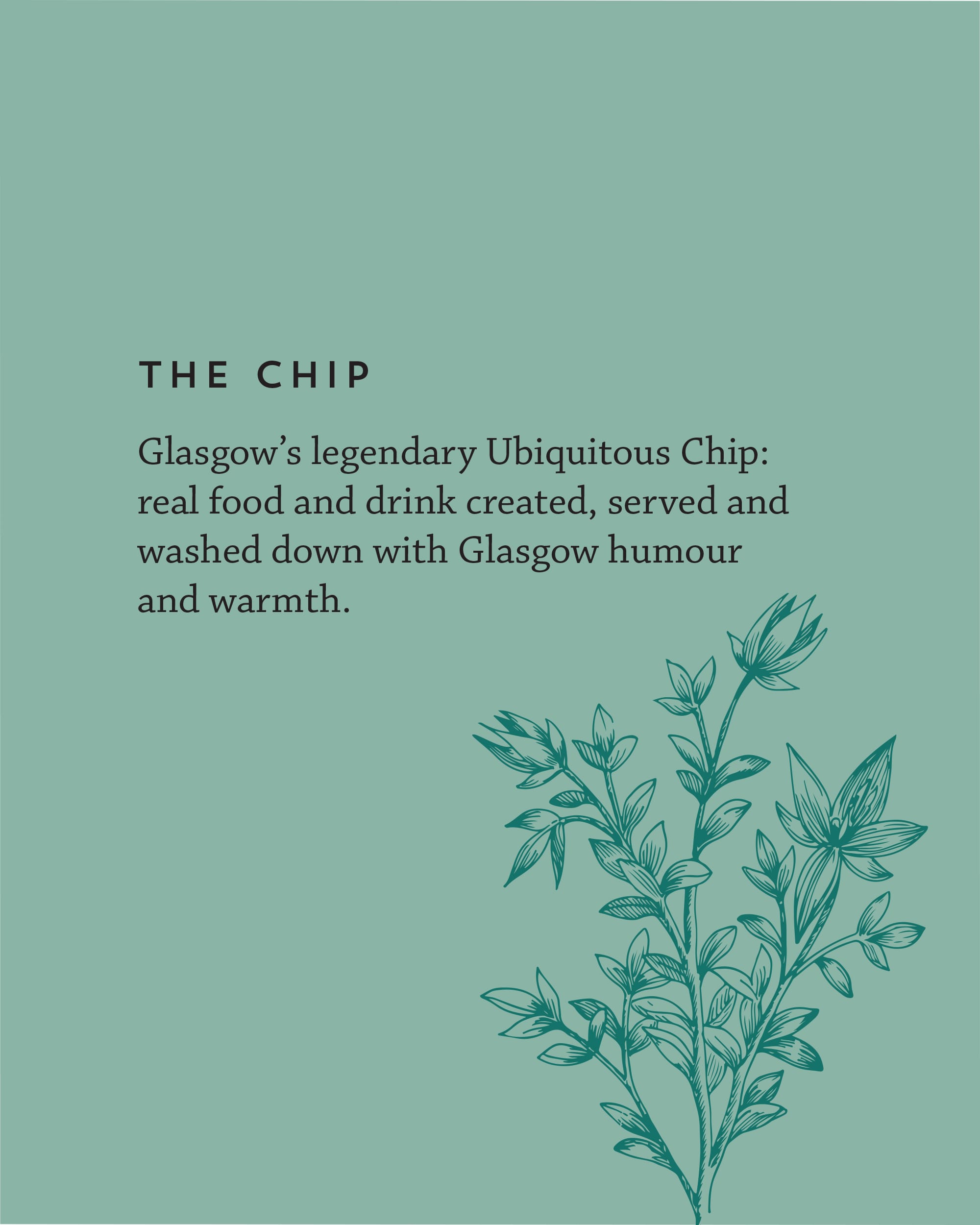 For the Chip, all they had was their famous logo, which made for a blank canvas across the rest of the brand. We took reference photos throughout the venue and derived a brand colour palette of earthy greens, and blues, with pops of vivid mustard and maroon reflecting their bold furniture. We brought in vintage line illustrations of foliage, to add textures and to reflect the unique, continental indoor-outdoor feel of their leafy courtyard.